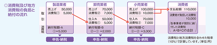 ・商品などの価格に上乗せされた消費税と地方消費税分は、最終的に消費者が負担し、納税義務者である事業者が納めます。課税される取引
